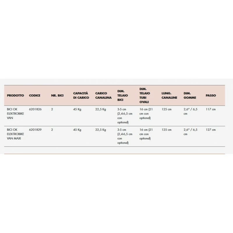 - canalina da 125 cm, interasse massimo della bici 117 cm