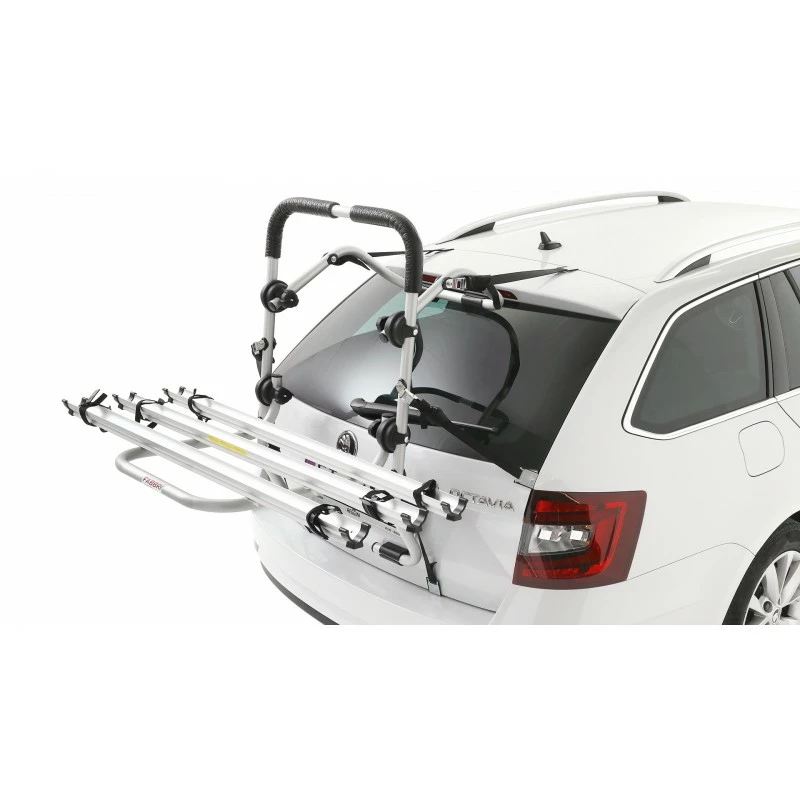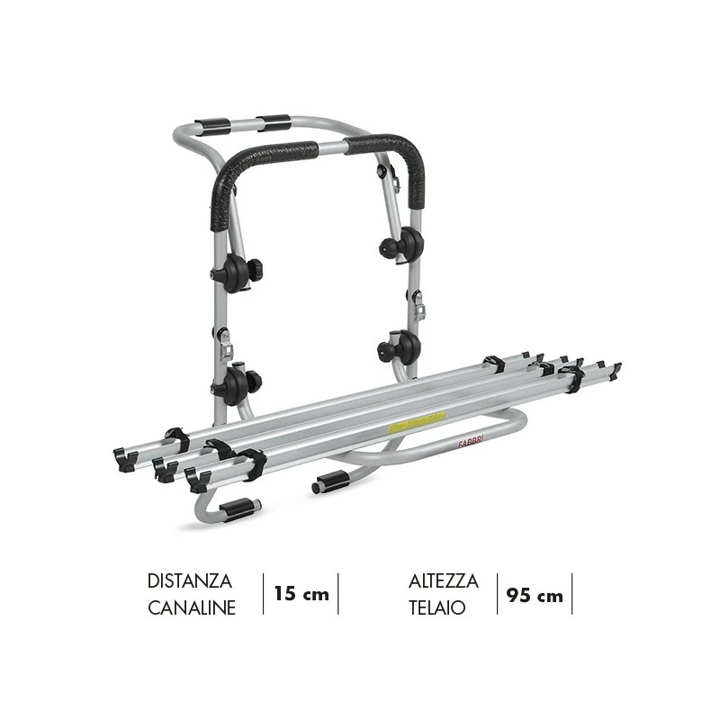 Portabici posteriore per il trasporto di 3 biciclette, realizzato per vetture con cofano o portellone standard così come per vetture con spoiler, lunotti di vetro o paraurti in plastica (v. Application List in www.fabbri.info)