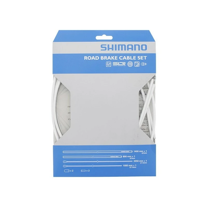 Shimano, Cavi e guaine, set cavi freno anteriore + posteriore, Race, colore bianco, guaine SLR: 5mm x 800mm (1x), 5mm x 1400mm (1x), cavi: ricoperti in PTFE 1,6mm x 1000mm (1x), 1,6mm x 2050mm (1x), terminali cavo e guaina inclusi